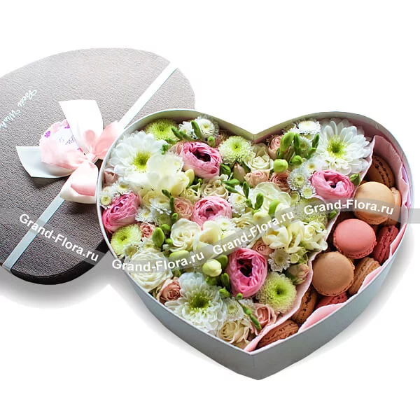 Стандартный (на фото): хризантема белая - 1 шт., хризантема белая (сантини) - 2 шт., фрезия белая - 4 шт., рунункулюс розовый - 5 шт., роза кустовая розовая - 1 шт., оазис, макарунс - 15 шт., коробка большая в виде сердца (30х30см).