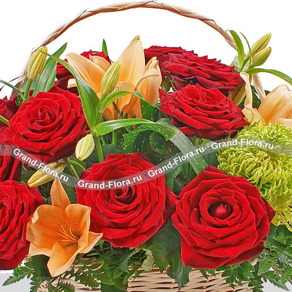 Стандартный (на фото): роза красная (50 см) - 15 шт., лилия желтая (по сезону. возможна замена на белую) - 3 шт., хризантема одноголовая зеленая - 3 шт., салал, папаратник - 6 шт., оазис, корзина.